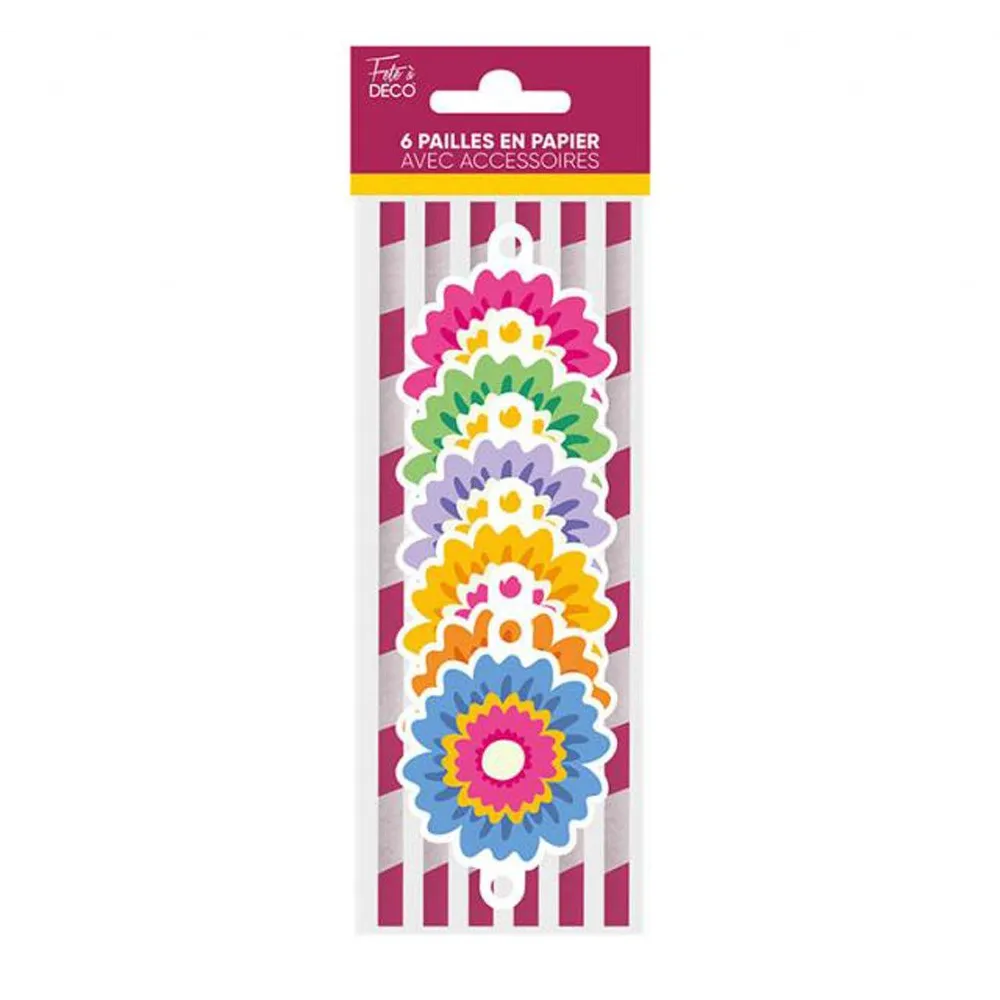 Lot de 12 pailles rayées fuchsia et blanc, thème floral cartonnées avec décoration fleurie, pour compléter votre déco de table d'anniversaire.