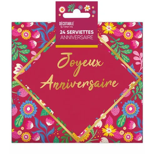 Lot de 24 serviettes papier thème floral Joyeux Anniversaire avec décoration fleurie. Découvrez notre gamme de produits fleuris pour une déco de table assortie.