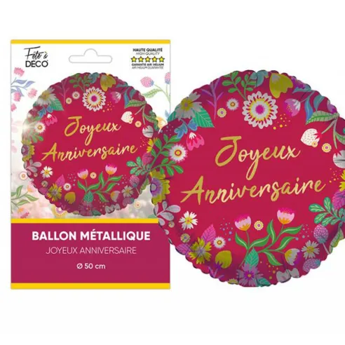 Ballon Joyeux Anniversaire métallisé dans les tons rouges avec motifs fleuris et d'un diamètre de 50cm. Pour une décoration anniversaire fleurie et colorée ça se passe dans votre magasin Festimania.