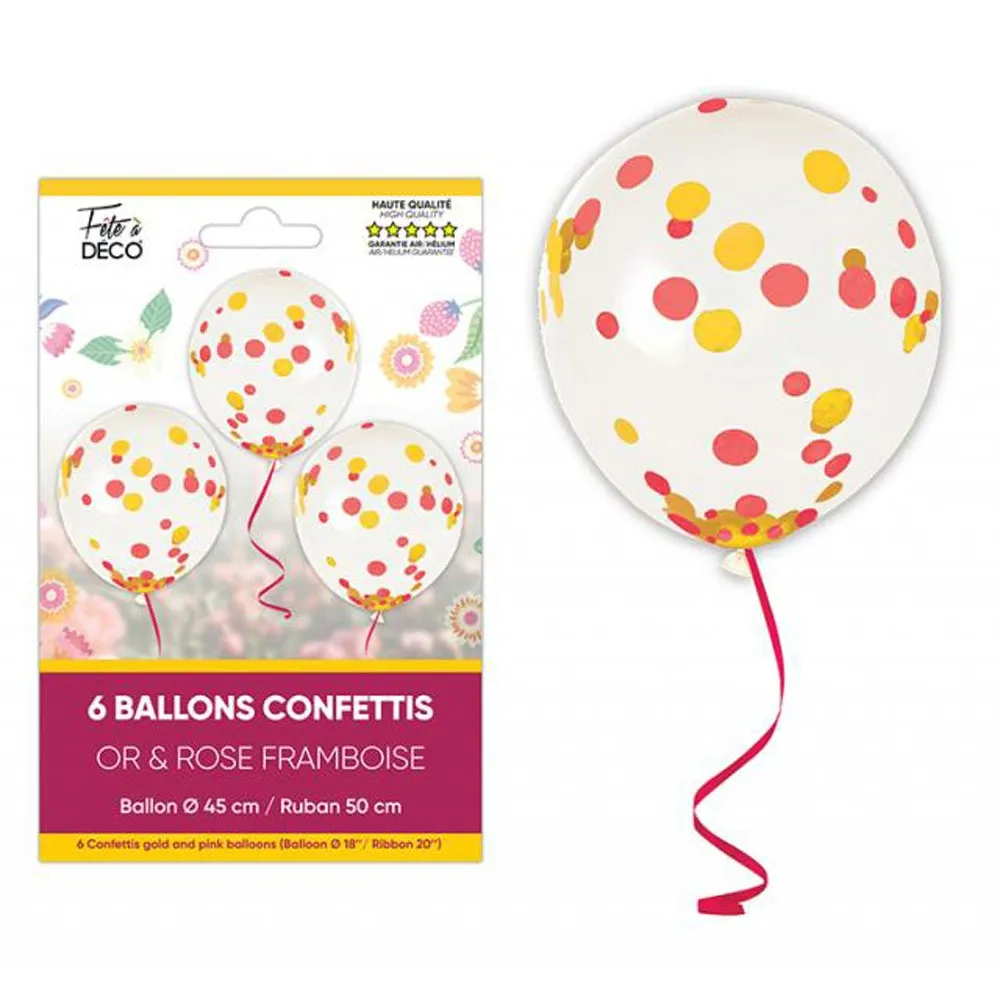 6 ballons confettis avec rubans colorés jaune et rose framboise et d'un diamètre de 45cm. Gonflage à l'air ou hélium pour une décoration anniversaire réussie.