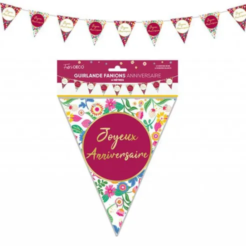 Guirlande fanions Joyeux Anniversaire thème floral d'une longueur de 6 mètres et imprimés de motifs fleuris. Pour décorer une salle ou une maison pour lui donner un air de printemps.