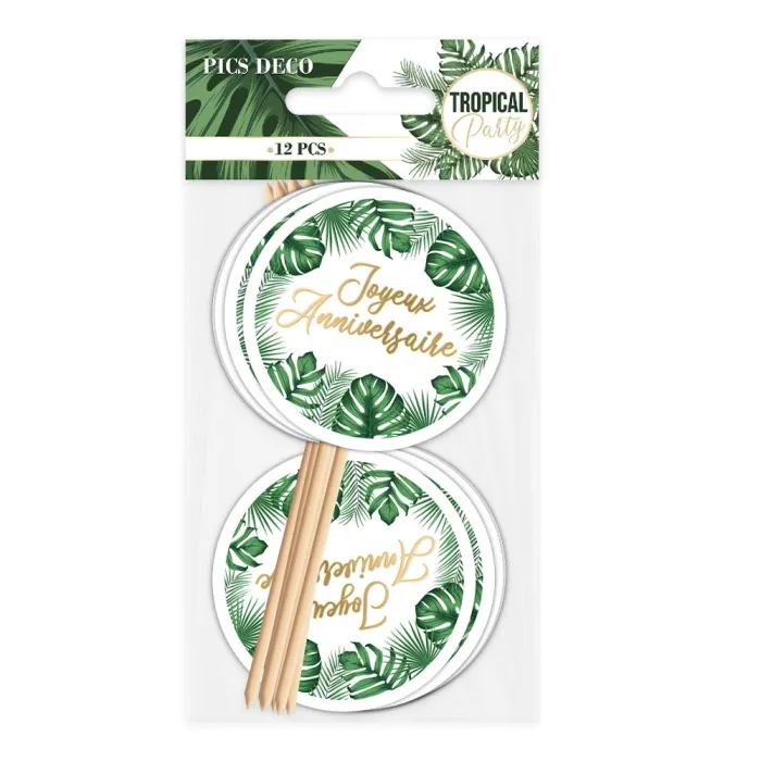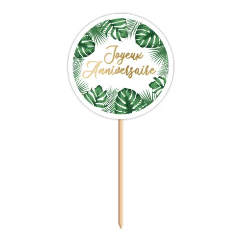 Avec la mention « joyeux anniversaire », ces pics de décoration ornés de feuilles tropicales sont des éléments incontournables pour accessoiriser vos plus belles fêtes d’anniversaire.