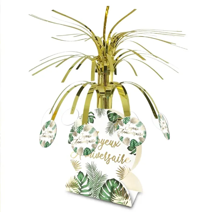 Il se compose d’un support en blanc aux motifs tropicaux. Tout autour sont fixés des petits serpentins or évoquant une fontaine ou un bouquet du plus bel effet.
