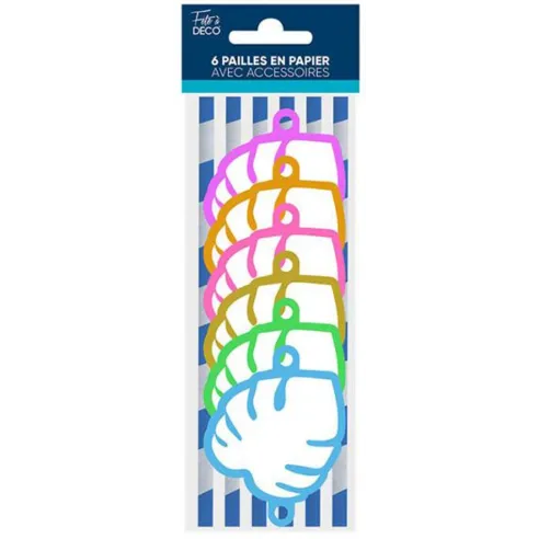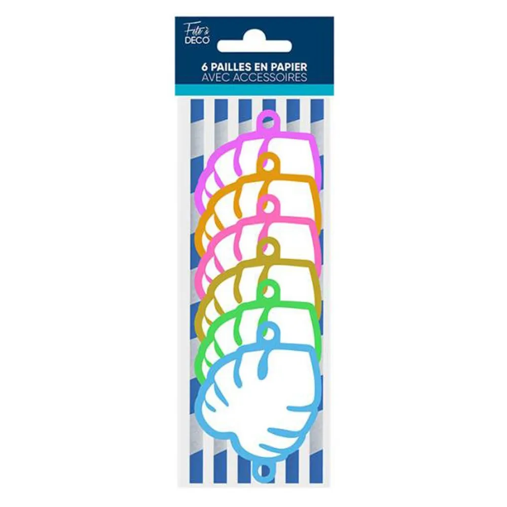 Lot de 12 pailles rayées bleu et blanc, thème tropical cartonnées avec décoration feuille de palmier. Pour une décoration de table d'anniversaire rappelant les îles.