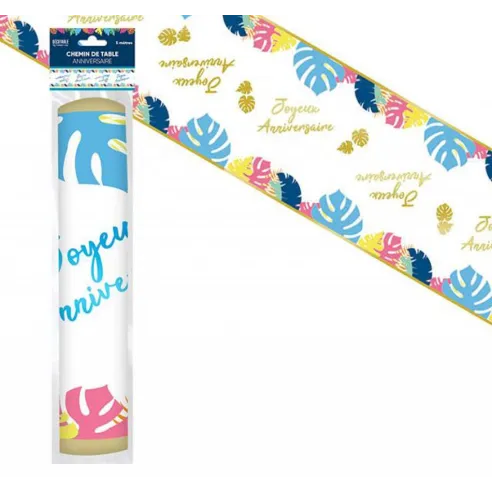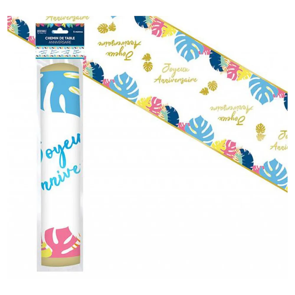 Chemin de table thème tropical Joyeux Anniversaire avec des feuilles de palmiers colorées imprimées et d'une longueur de 5 mètres. Une déco de table rappelant Hawaï et les îles lointaines.
