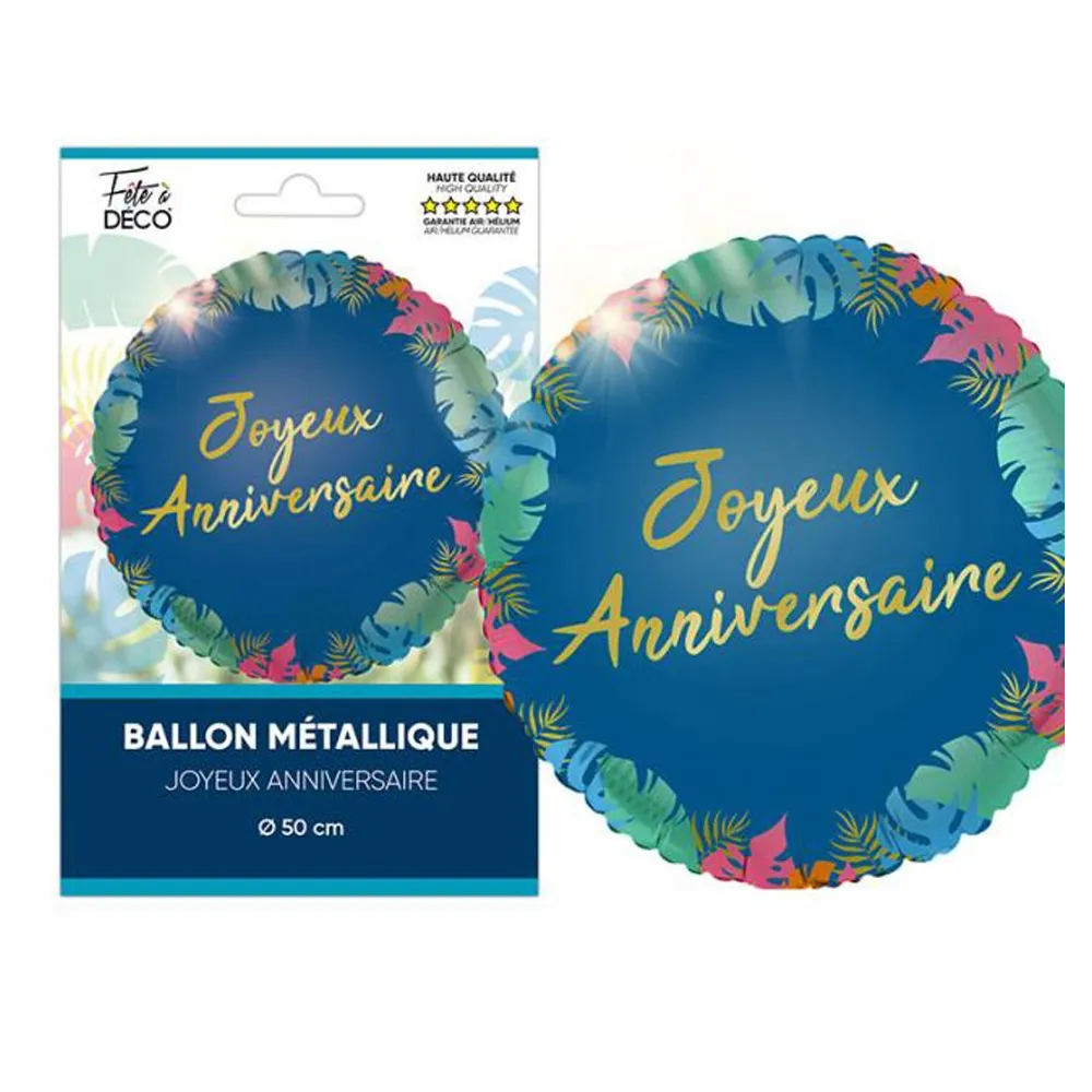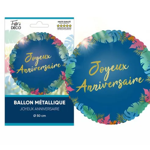 Ballon Joyeux Anniversaire métallisé thème tropical, dans les tons bleus avec motifs de feuilles de palmier sur le contour et d'un diamètre de 50cm. Pour une décoration anniversaire Hawaï rappelant les îles de l'océan Pacifique.