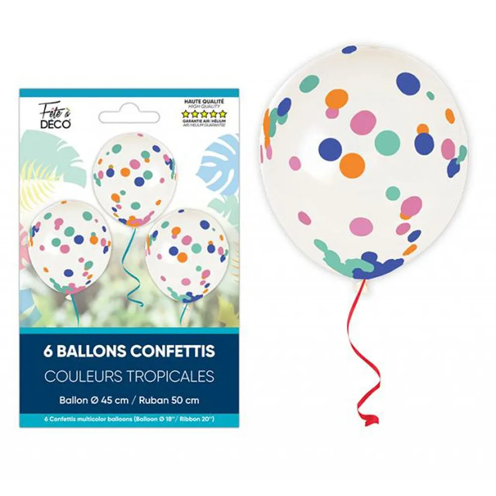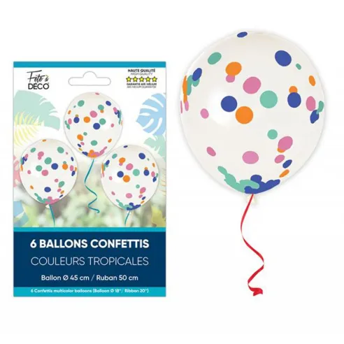 6 ballons confettis avec rubans colorés et d'un diamètre de 45cm. Gonflage à l'air ou hélium pour une décoration anniversaire adulte ou enfants réussie.