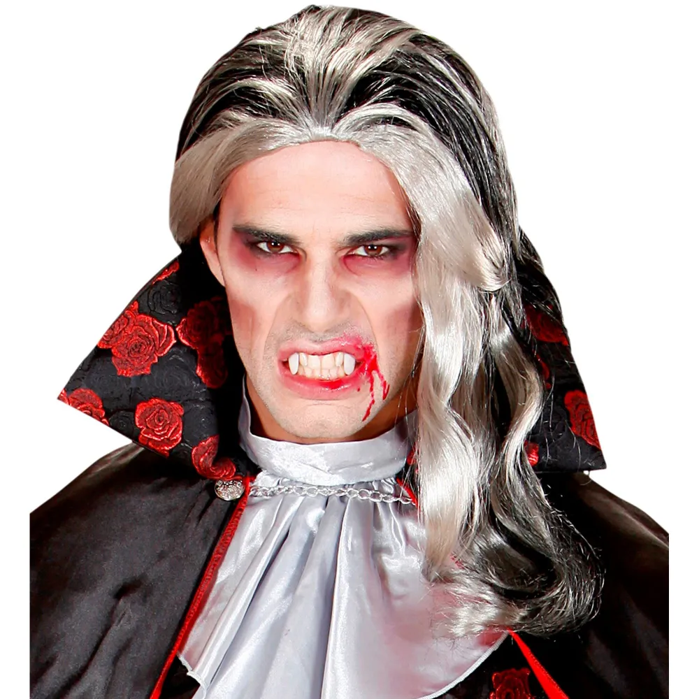 Set d'accessoires de maquillage pour se transformer en vampire à Halloween, comprenant: deux canines adhésif thermoplastique, sang en gel, éponge et palette maquillage avec blanc, noir, gris.